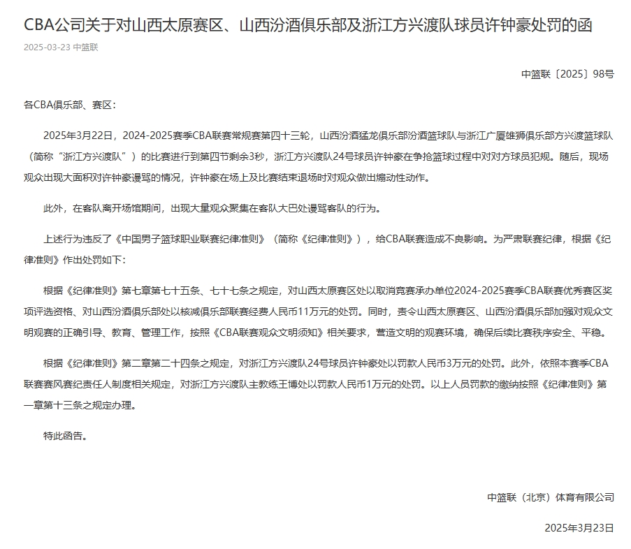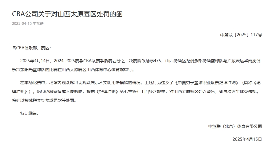 DB视讯官方登录入口4月18日讯 此前,CBA官方宣布了对此前晋粤大战双方违规行为的罚单,其中,山西赛区和山西俱乐部被严重警告,并核减15万经费。